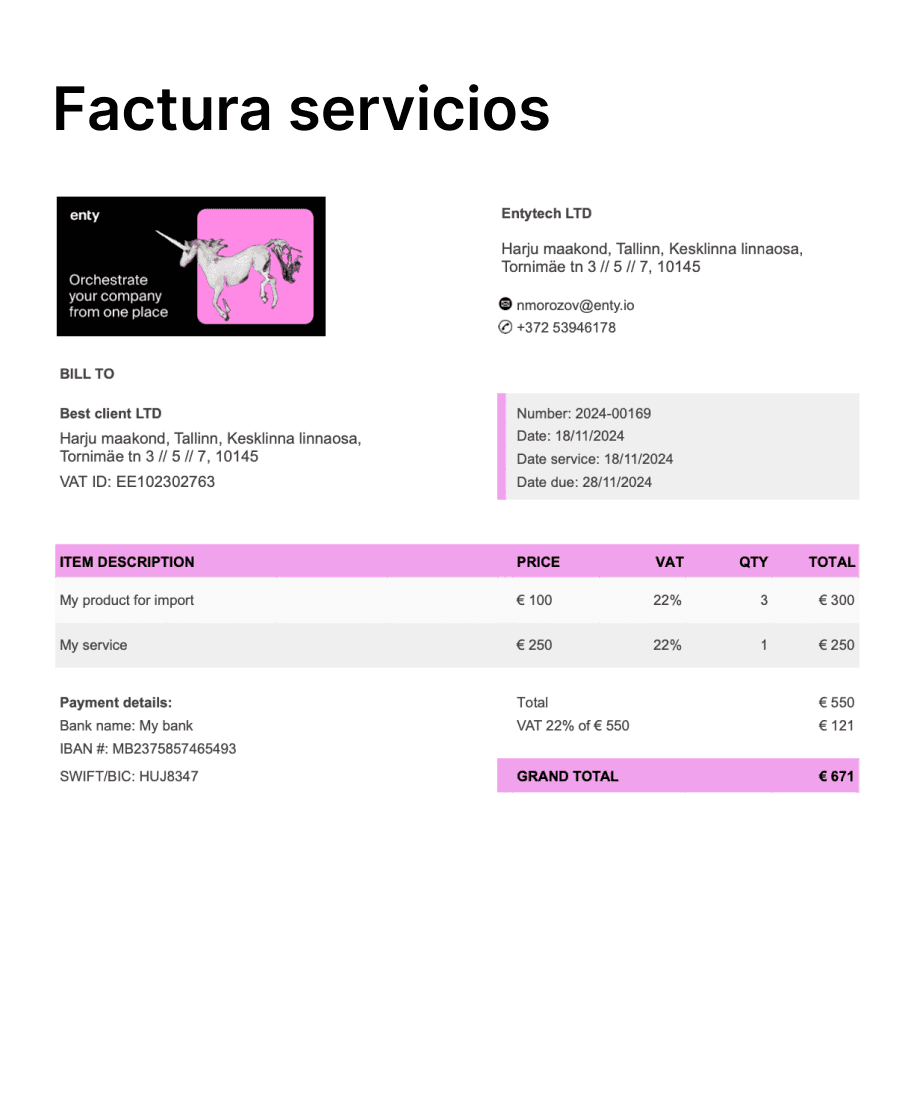 Con Enty.io, emitir facturas de servicios se convierte en un proceso sencillo, profesional y eficiente, permitiendo a los usuarios centrarse en su actividad principal sin preocuparse por la gestión administrativa.